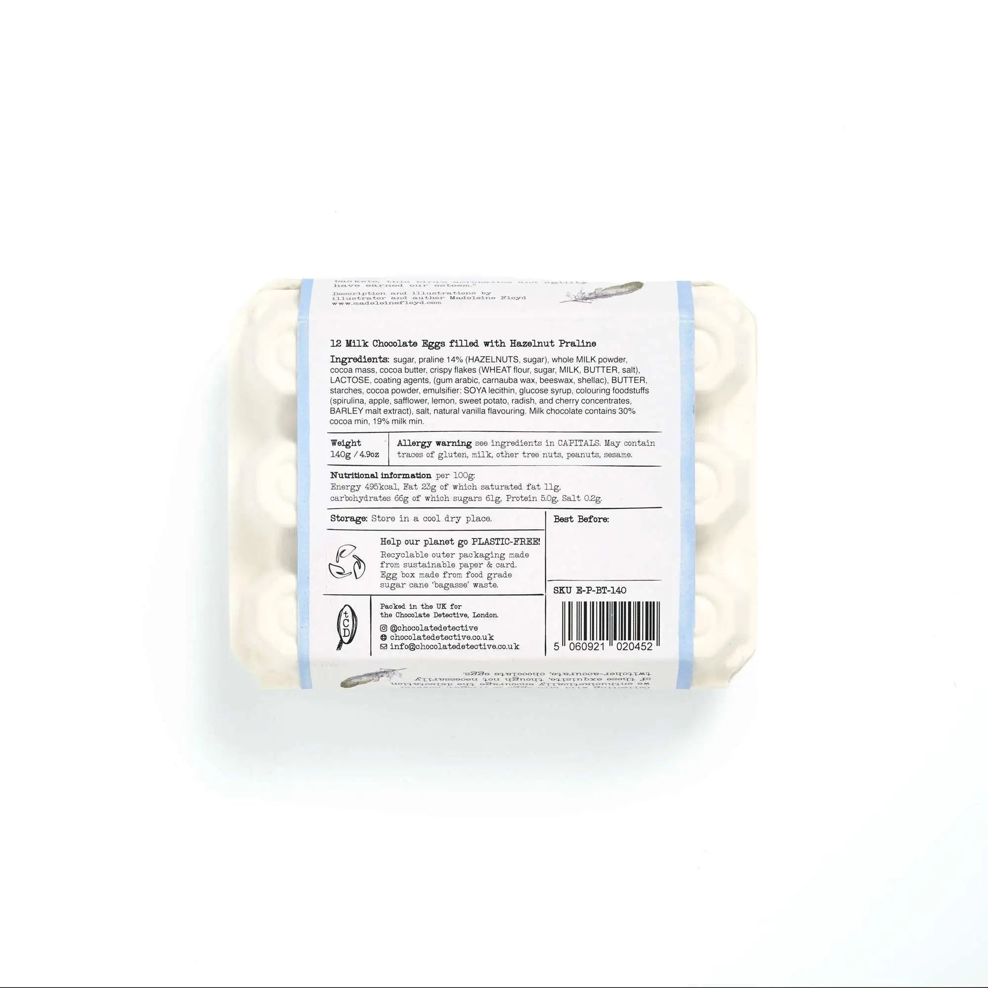12 Chocolate Eggs filled with a fine hazelnut praline. Layers of dark and milk chocolate are then filled with the praline before being wrapped in a fine sugar shell and life-like speckles.