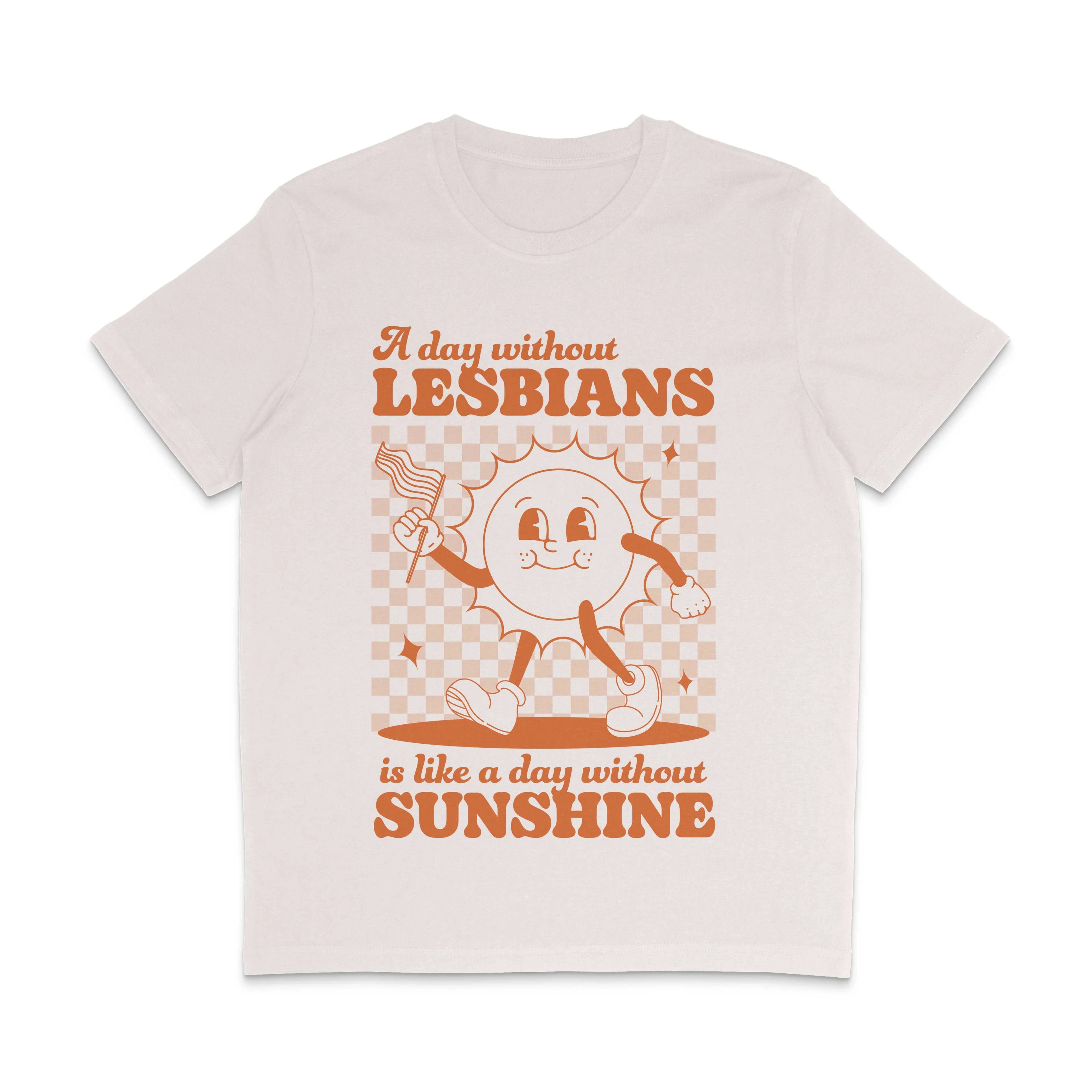 The 'A Day Without Lesbians...' slogan was first introduced at the San Francisco Gay Freedom Day parade in 1979. It was a response to anti-LGBT views of Anita Bryant, a well-known political activist who appeared in commercials for the Florida Citrus Commission using the phrase 'Breakfast Without Orange Juice is Like a Day Without Sunshine.' In protest, activists created their own versions of the slogan, including the lesbian version featured in this design.