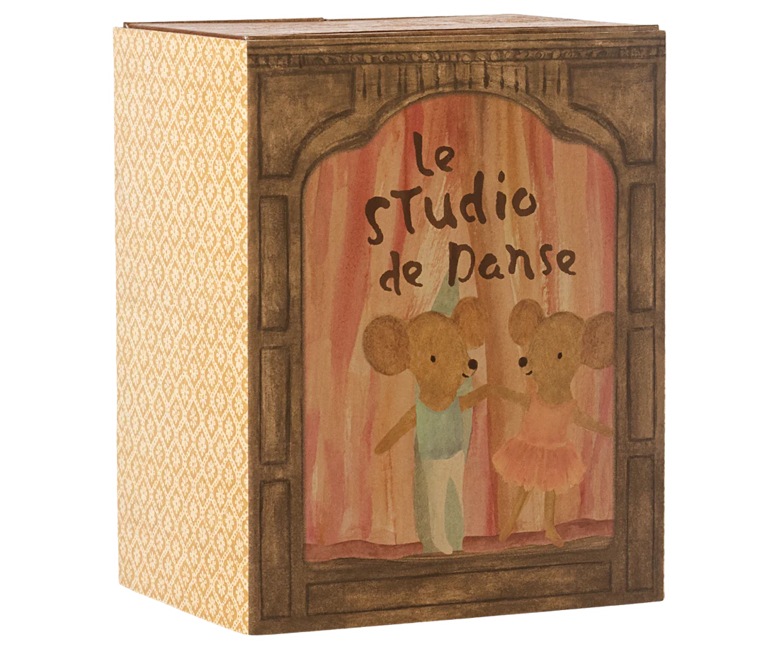 Open the doors of this magical box and explore a world of dance, stardust and storytelling. This set includes a paper box, that is both a dancestudio and a cosy mouse house, as well as two mice dressed for hours of dance in their beautiful clothes.